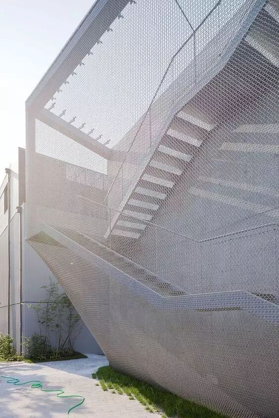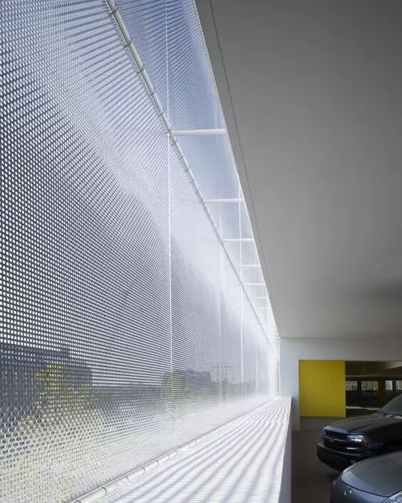 金属特性铝是一种高延展性、密度小且导电性能良好的金属,在建筑表皮的应用上容易产生明快的空间效果。能反映周边环境的朦胧影像和色调。相比较玻璃的透明性和金属板材的不透明性,穿孔铝板在二者之间达到一种半透明的效果,可以形成像纱一样的朦胧感和轻盈感,丰富建筑表皮的表现力。