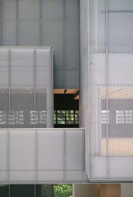 穿孔铝板表皮环绕建筑,由室外看向室内,表皮为“图”而室内空间为“底”,且随着光线和观察视角的变化可以感受到的建筑界面开放程度亦不同。从室内看往室外时,穿孔铝板表皮为“图”而室外为“底”,由于室外空间亮度高于室内空间,人眼会不自觉捕捉亮度高的空间,透过高穿孔率的穿孔铝板经过视觉景象叠加处理仍可以充分体验室外的景致。